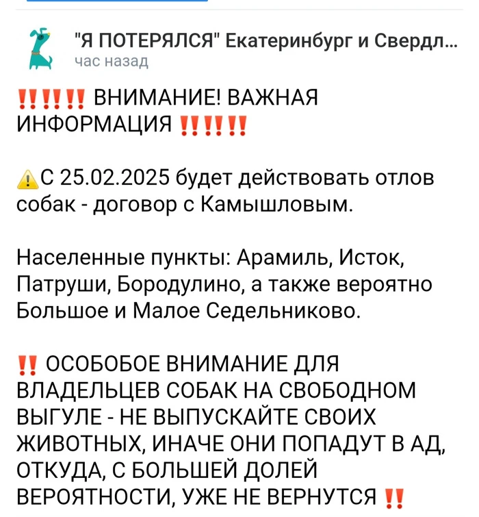 urtica: Так что оставаться на улице этой собаке ОЧЕНЬ опасно. Камышловские отловщики давно "прославились" своей жестокостью при отлове и содержании отловленных. Мало кто выживает.