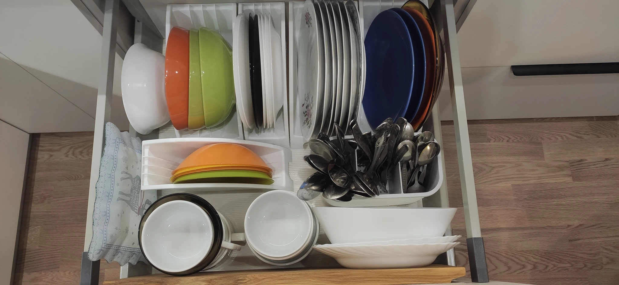 Отдельно столовые приборы, не знаю, нам удобно взять тарелку и к ней сразу ложку, можно предположить, что тарелки брать неудобно, но это не так, а складывать точно удобнее, стопкой из ПММ в органайзер. Именно такие доп.ящики сверху отдельно очень неудобными показались в салонах, некоторые менеджеры согласились, открытие в два приема, или чтобы ложку добыть два ящика открыть. У вас ещё ручки профильные вырезы, я чуть ногти на таких образцах не оставляла, очень тяжело, а если проблема с суставами, почти невозможно открыть, но это я отступила) тут кому что удобнее