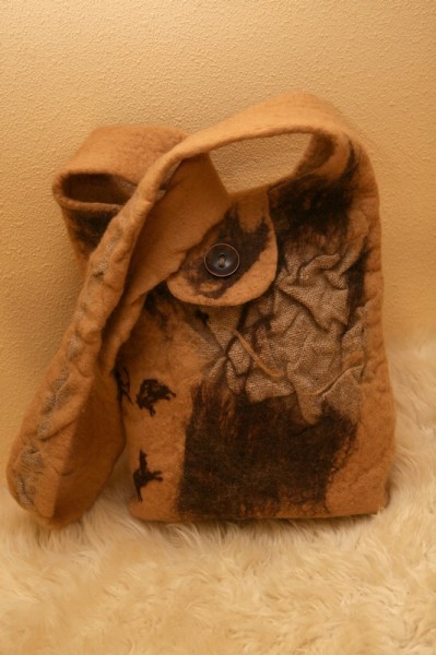 Хочу критики про качество войлока, какой то он в целлюлите и морщинах... Данной сумке в силу стиля это не мешает , но вообще хотелось бы ровной поверхности :( Это раскладка виновата? Или шерсть троицкая полутонкая так усаживается?
