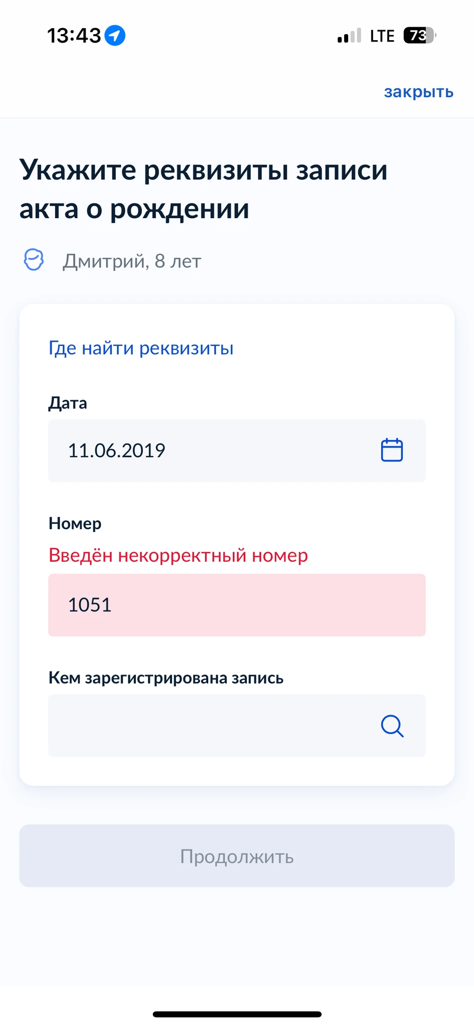 вы какой номер пишите? надо 4х значный, номер актовой записи