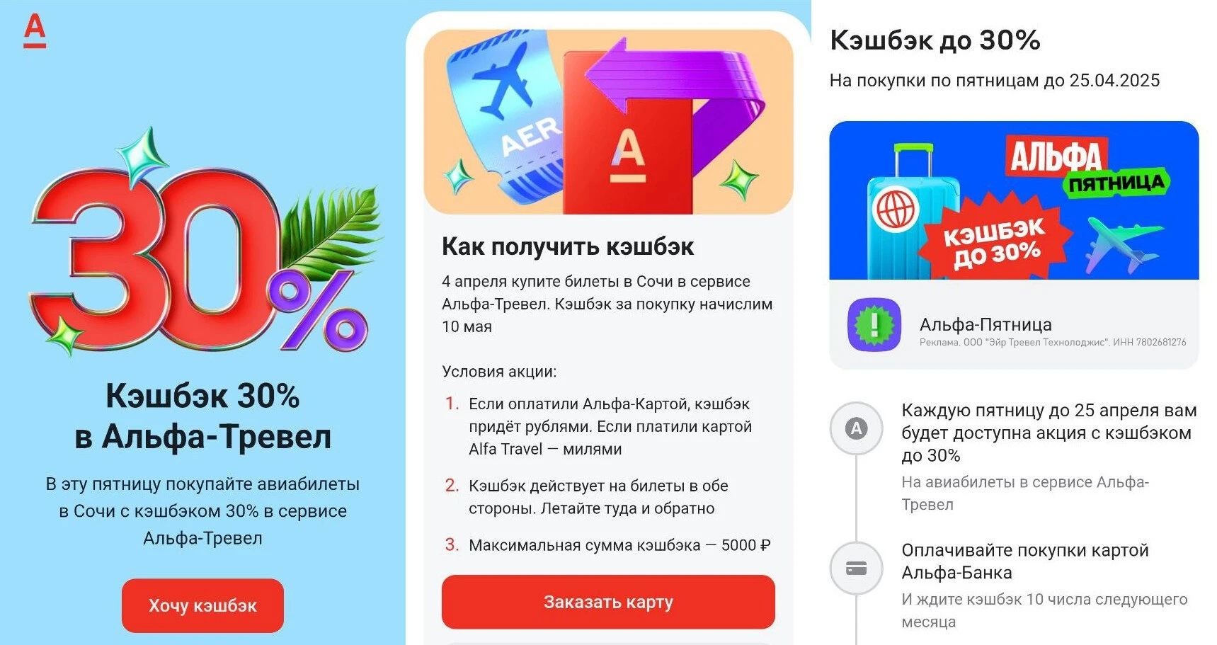 04.04.25 – кэшбэк 30% на первую покупку авиабилетов в Сочи и обратно с датой вылета по 30.06.25 (ищем в мобильном приложении по слову "пятница")
