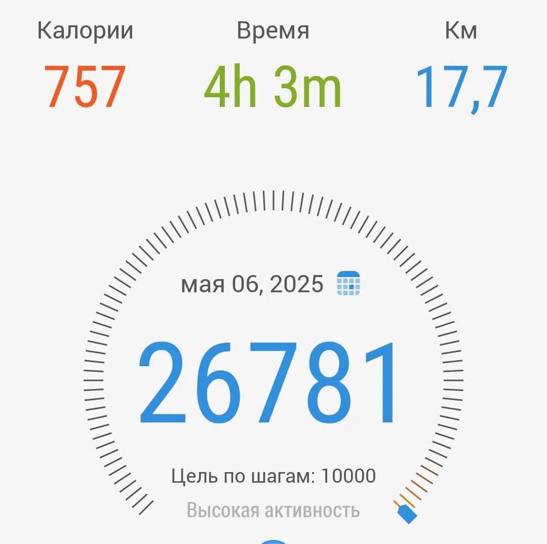 Пройдено 16тыс., силовая тренировка была. Съедено много, не считала.